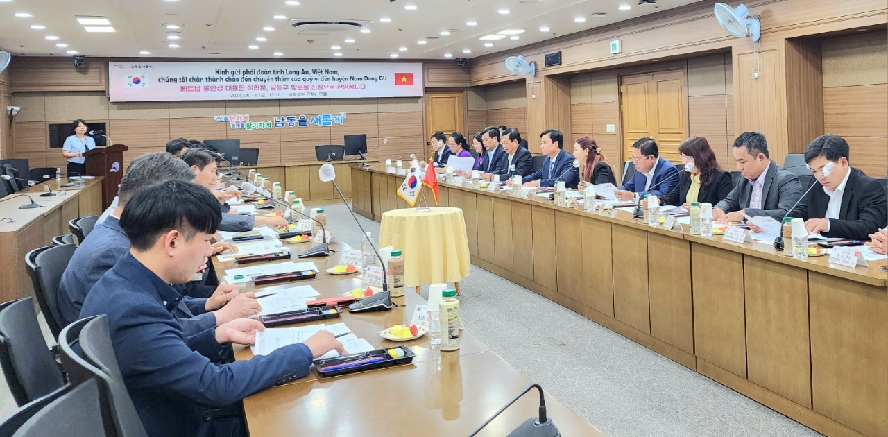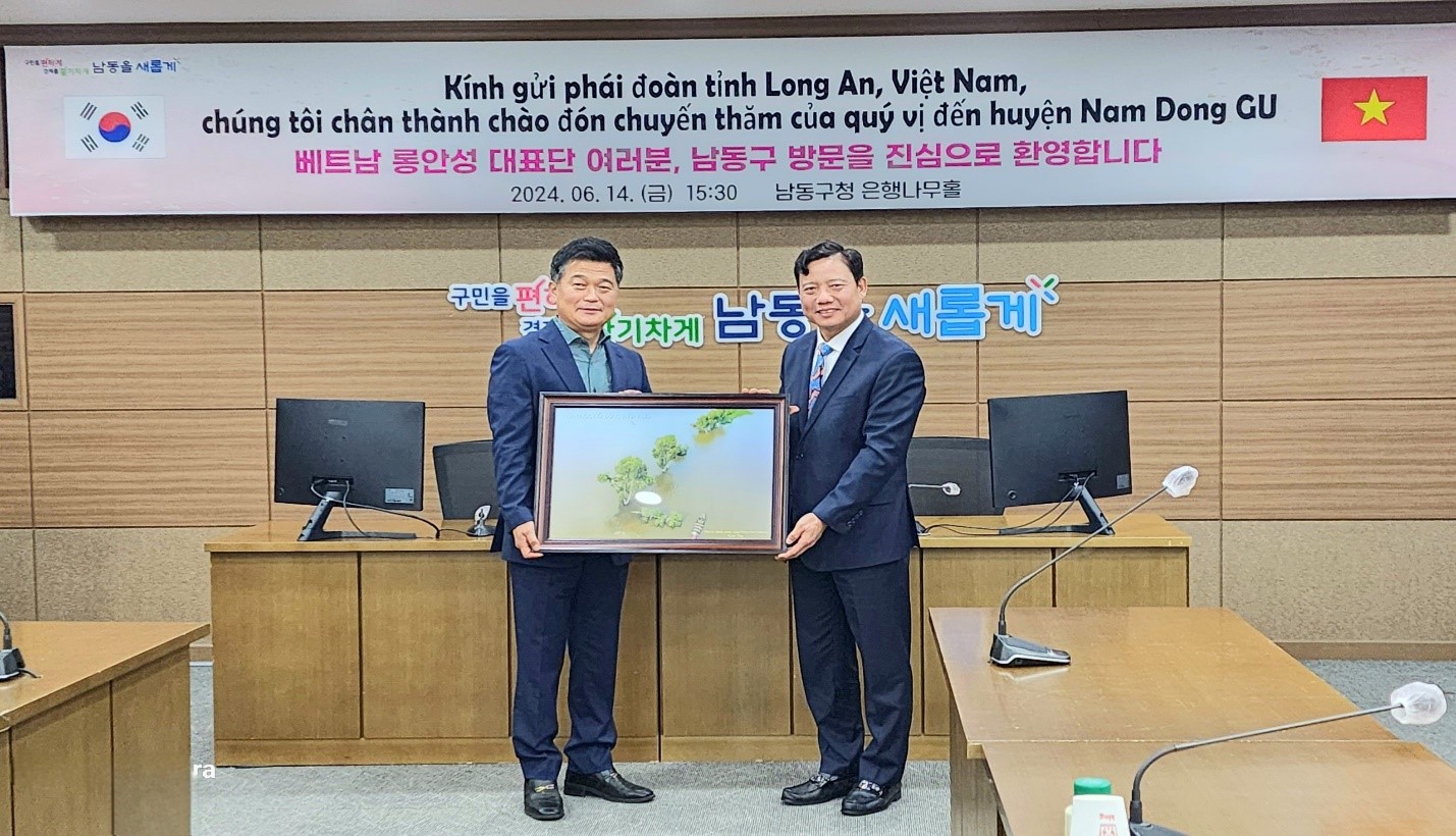 Chiều ngày 14/6/2024, Đoàn cán bộ tỉnh Long An đã đến thăm và làm việc với chính quyền Quận Namdong, thành phố Incheon, Hàn Quốc. Ngài Park Jong Hyo, Quận trưởng quận Namdong tiếp và làm việc với Đoàn. Tại buổi làm việc, ngài Quận trưởng gửi lời cảm ơn lãnh đạo tỉnh Long An đã dành thời gian đến thăm và làm việc tại quận Namdong, thành phố Incheon, Hàn Quốc; đồng thời giới thiệu tổng quan về điều kiện tự nhiên, thông tin kinh tế xã hội, quy hoạch chung và định hướng phát triển của quận Namdong. Ngài Quận trưởng chia sẻ quận Namdong có diện tích 57.4km2 dân số là 504,604 người, với 20 đơn vị hành chính cấp phường, Namdong là nơi đặt trụ sở chính của Cảnh sát thành phố Incheon, Khu liên hiệp công nghiệp Namdong, và trường Y tế Gachon, đồng thời quận Namdong cũng là một trong những điểm đến thu hút khách du lịch của thành phố Incheon.