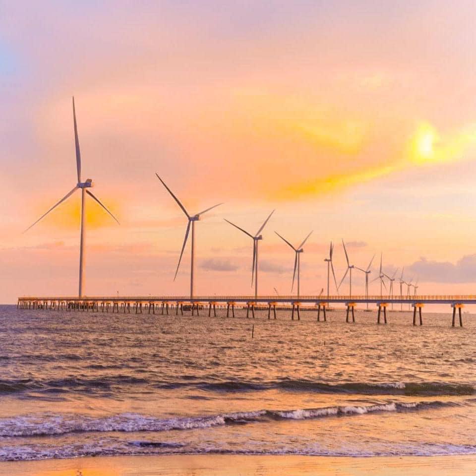 Bình minh ở bãi biển Ba Động ngắm nhìn cầu dẫn dài hơn 4 cây số dẫn ra nơi lắp đặt các trụ tua-bin gió