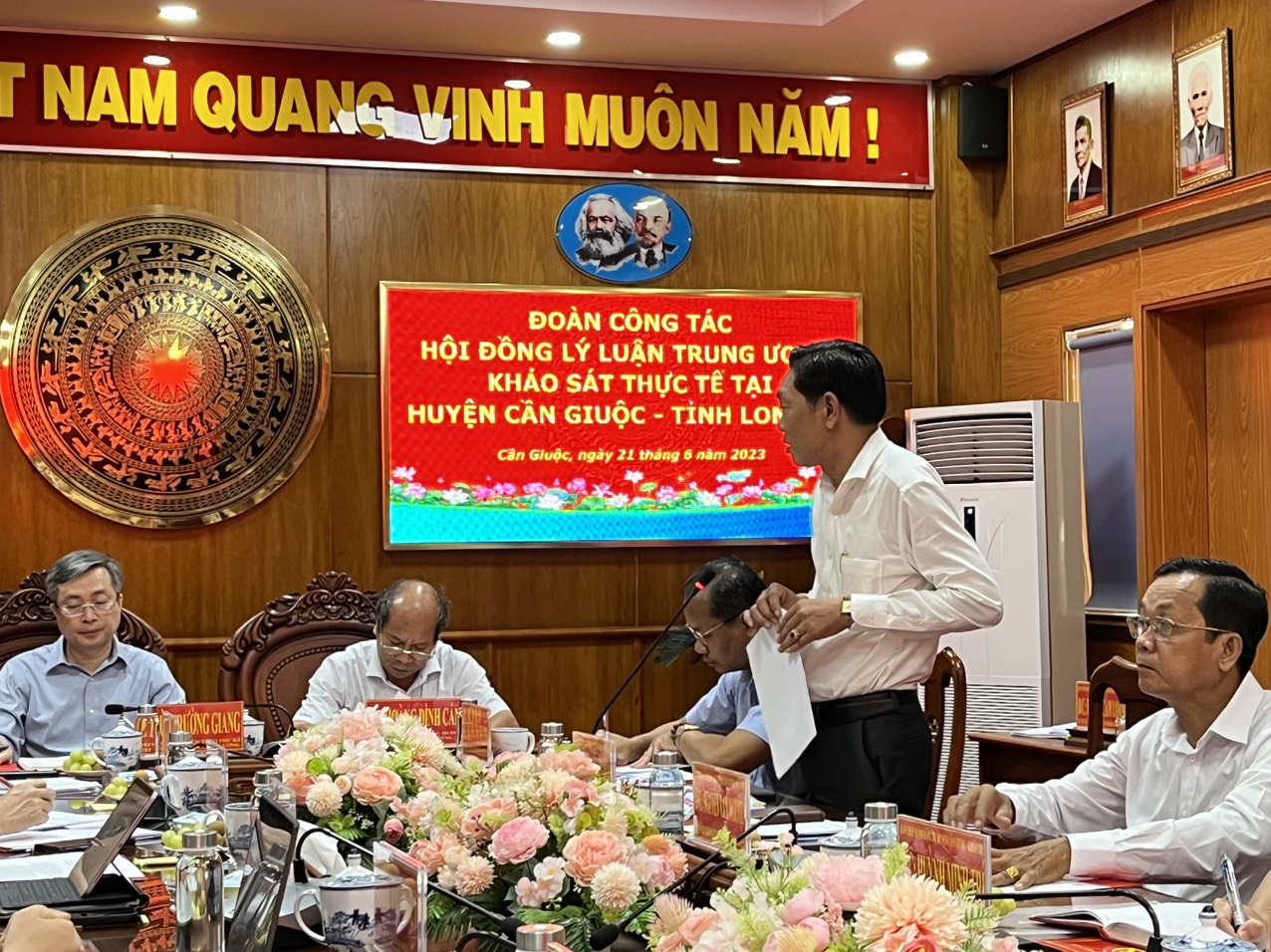 Tại buổi làm việc, Đoàn khảo sát của Hội đồng lý luận Trung ương đã được nghe đồng chí Nguyễn Phước Hùng, Phó Bí thư Thường trực Huyện ủy Cần Giuộc trình bày báo cáo chuyên đề “Vai trò của cấp ủy, chính quyền, cơ quan dân cử trong lãnh đạo, chỉ đạo phát triển kinh tế - xã hội gắn với xây dựng Đảng và hệ thống chính trị trong sạch, vững mạnh, phát huy quyền làm chủ của Nhân dân”.