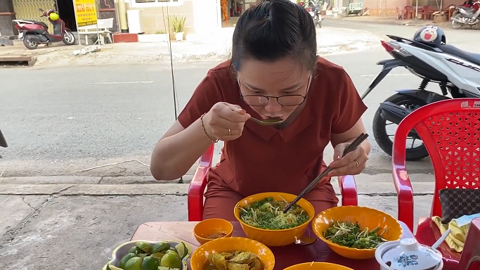 Khi chị bán hàng bưng mấy tô bún nóng hổi đang bốc khói nghi ngút ra, ai nấy đều ngẩn ngơ nhìn những miếng cá lóc xắt miếng, da heo luộc được ướp nghệ vàng ươm, mùi sả, mùi nghệ tươi thơm lừng, ít đậu phộng (lạc) rắc trên mặt tô bún. Tôi gắp một ít rau kèo nèo xắt nhỏ vào tô, múc một ít muối ớt, nặn thêm trái tắc, rồi bắt đầu thưởng thức. Chu choa nước thật ngọt và thanh, đúng kiểu ngọt từ xương cá và đầu cá. Rau kèo nèo có vị ngọt pha với vị chát chát và hơi đắng nhưng ăn cùng với bún, thịt cá chấm thêm chút cay nồng của muối ớt, hòa quyện cùng vị béo bùi của đậu phộng, hương vị ngon thật khó tả.