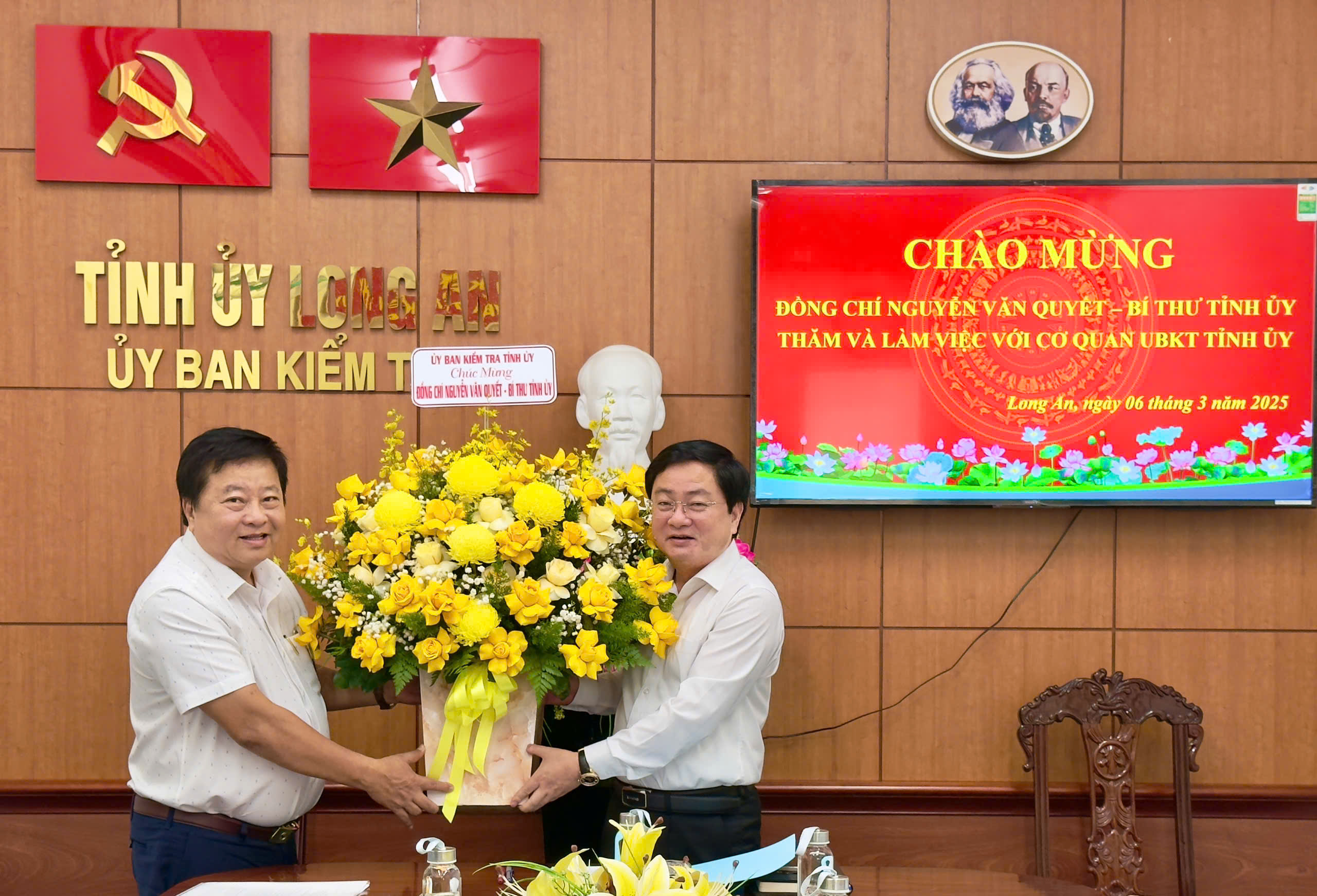 Ủy viên Ban Thường vụ Tỉnh ủy, Chủ nhiệm Ủy ban Kiểm tra Tỉnh ủy – Trần Văn Dũng tặng hoa cám ơn Bí thư Tỉnh ủy – Nguyễn Văn Quyết đến thăm và làm việc tại Ủy ban Kiểm tra Tỉnh ủy